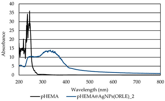 The dispersion of the AgNPs(ORLE) in pHEMA within pHEMA@AgNPs(ORLE)_2 was verified by the solid state UV–Vis spectroscopy (Figure 5). The characteristic broad band at 330 nm in the solid state UV–Vis spectrum of pHEMA@AgNPs(ORLE)_2, which is absent in the corresponding one of free pHEMA, suggested the incorporation of the AgNPs(ORLE) in it.