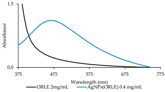Since absorption band in UV–Vis spectra of AgNPs between 400–500 nm has been assigned to the collective resonance of electrons at the surface of the silver nanoparticles, these bands were used for the determination of silver nanoparticles’ size [17,18]. The UV–Vis spectrum of AgNPs(ORLE) in double distilled (dd) water solution (0.4 mg/mL) (Figure 6) exhibited a broad band at 479 nm, which correlated to nanoparticles’ size of ~65 nm [19]. It is mentioned here that the size of 20 nm, which was determined by XRPD spectroscopy (see above), refers to crystallite sizes and not to solubilized particles studied here by UV–Vis spectroscopy.