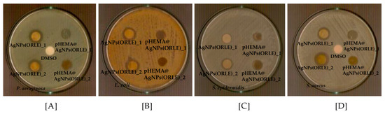 The procedure was performed as previously reported [6,7,23]. Agar plates were inoculated with a standardized inoculum (108 cfu/mL) of the microorganisms. Discs of pHEMA or pHEMA@ORLE_2 and pHEMA@AgNPs(ORLE)_2 with 10-mm diameter or ORLE, AgNPs(ORLE) were placed on the agar surface and the Petri plates were incubated for 20 h.