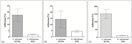 Colonization of epithelial cells. Adhesion of the toxigenic C. ulcerans strain KL756 and the non-toxigenic C. silvaticum isolate W25 to different human epithelial cell lines: (a) Detroit 562 cells, (b) HEK-Blue 293 hTLR2 cells, (c) HeLa cells. The respective cell line was seeded 24 h prior to infection and infected with bacteria at a multiplicity of infection (MOI) of 50 for 90 min. Columns and error bars represent the results and standard deviations of three independent biological replicates carried out with three technical replicates each (n = 9). Adhesion efficiency was calculated based on the ratio of colony-forming units (CFU) prior to infection and CFU on the lysate plates after infection, multiplied by 100.