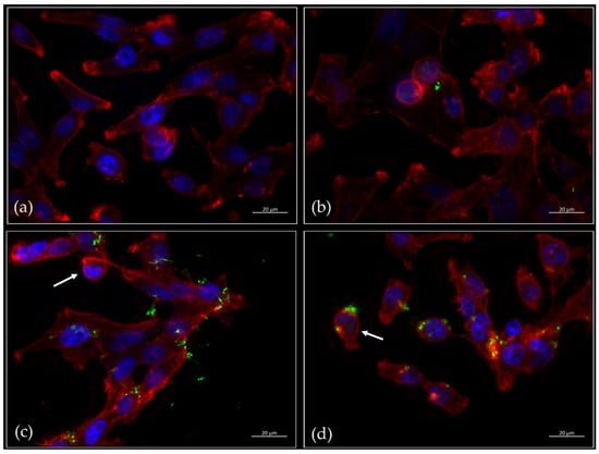 Fluorescence microscopy of epithelial cells infected with different corynebacteria. (a) Untreated HeLa cells, cells infected (b) with C. glutamicum ATCC13032 pERP1p45_gfp, (c) with C. ulcerans KL756 pERP1p45_gfp and (d) with C. silvaticum W25 pERP1p45_gfp. Red: Phalloidin-iFluor 647, blue: DAPI, green: GFP. Arrows indicate HeLa cells with morphological changes from spindle to disc-shape forms.