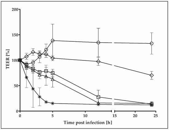 Detroit 562 cells were seeded in transwells (12 mm, 0.4 µm pore size, polyester membrane, 12-well plate, Corning Incorporated Costar) at a density of 1 × 105 cells per well and incubated under cell culture conditions (37 °C, 5% CO2 and 95% humidity) until a polarized cell monolayer with a TEER of at least 800 Ω cm−2 was formed. For infection, bacteria were grown in 50 mL BHI medium with 10% FCS and 0.05 M Tween 80 until they reached the exponential phase (OD600 of 0.4 to 0.6), harvested by centrifugation at 4000× g, washed with PBS and adjusted to an OD600 of 5. One hundred µL of this suspension were used for infection. Transepithelial resistance was measured with an epithelial Volt/Ohm Meter (World Precision Instruments, Friedberg, Germany) for every 60 min; after 180 min the supernatant of the infected Detroit 562 cells was removed and the cells incubated overnight in fresh DMEM medium without antibiotics to avoid detrimental effects of bacterial growth.