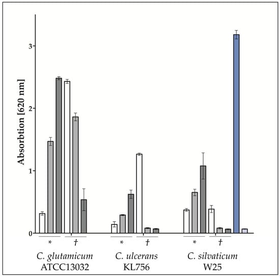 TLR2 receptor activation by C. glutamicum ATCC13032, C. ulcerans KL756 and C. silvaticum W25. HEK-Blue 293 hTLR2 receptor cells were infected at a MOI of 100 (white), 10 (light grey) and 1 (dark grey) with viable (*) and UV-killed (†) bacteria. Heat-killed Listeria monocytogenes (HKLM) (blue) were used as positive and phosphate-buffered saline (PBS) (light blue) as negative control. Experiments were performed in three independent biological replicates each in technical triplicates and mean values and standard deviations are shown.