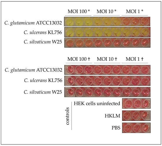 To exclude a putative indirect effect of bacterial growth on TLR2 receptor activation, culture medium color was monitored. Phenol red served as an indicator for acidified, spent medium, and changes from red to yellow were correlated with strong bacterial growth, as seen for C. glutamicum ATCC13032 at MOI 100 to MOI 10 and C. ulcerans KL756 from MOI 100 to MOI 1. No color change was recognized when cells were incubated with UV-killed bacteria, PBS, HKLM and in the case of uninfected cells. In addition, no color change was recognized, when cells were incubated with C. silvaticum W25, which may indicate minor or no bacterial metabolism and growth in cell culture medium (Figure 6).