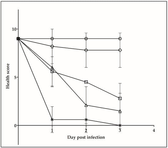 Infection of G. mellonella larvae were conducted as described before [15]. Therefore, bacteria were cultured as described above. Bacteria were harvested by centrifugation (4500× g, 10 min) at an OD600 of 0.4 to 0.6, resuspended in 10 mM MgSO4 and adjusted to OD600 of 10. A 50 µL Hamilton syringe was used to inject 5 µL of bacteria via the hindmost left proleg. Uninfected larvae and larvae injected with 10 mM MgSO4 were used as control. For each bacterial strain, five wax moth larvae were infected and incubated at 22 °C. Each infected individual larva was monitored at the day of infection and daily for three days using the Health Index Scoring System [39]. A score between 9 and 10 suggests healthy, uninfected larvae, whereas a lower score indicates impaired health.