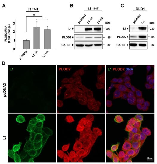 Induction of lysyl hydroxylase 2 (PLOD2) expression in colorectal cancer (CRC) cells by the overexpression of L1. (A) The level of PLOD2 RNA was determined in control clones of LS 174T transfected with pcDNA3 and in LS 174T CRC cell clones stably overexpressing L1 (L1 cl1 and cl2) by RT-PCR. (B) Western blot analysis of PLOD2 protein levels in the CRC cell lines described in (A). (C) Western blot analysis of PLOD2 protein levels in DLD1 CRC cells transfected with pcDNA3 or with L1. (D) Double immunofluorescence localization and levels of PLOD2 (red) and L1 (green) in LS 174T CRC cells expressing the control pcDNA3 plasmid or L1. DNA was visualized using DAPI (blue). * p < 0.05.