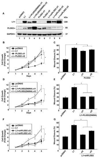 PLOD2 is required for the increase in cell proliferation and motility conferred by L1 in CRC cells. (A) The levels of endogenous and transfected PLOD2 proteins were determined in LS 174T cells stably expressing the control pcDNA3 plasmid (lane 1), L1 (lane 2), L1 plus a dominant negative PLOD2 mutant [L1 + PLOD2 (D689A) cl1 and cl2, lanes 3 and 4], PLOD2 (lanes 5 and 6) and L1 plus shRNA to PLOD2 (L1 + shPLOD2 cl1-cl3, lanes 7–9). (B,D,F) Analysis of the proliferation rates in serum-free medium of the cell clones described in (A) over 5 days. (C,E,G) Analysis of the motility of the cell clones described in (A) by the closure of “scratch wounds” introduced in the confluent monolayers of these CRC cell clones. * p < 0.05.