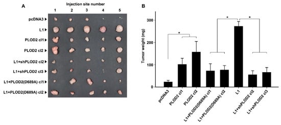 Next, we wished to determine the involvement of PLOD2 in the L1-mediated increase in CRC cell tumorigenesis and liver metastasis in vivo. Subcutaneous injection into nude mice of the CRC cell lines described in Figure 2A revealed that PLOD2 effectively stimulated tumor growth, albeit to a lesser extent than L1 (Figure 3A,B, compare PLOD2 cl1 and cl2 to L1). The suppression of endogenous PLOD2 activity in L1 overexpressing cells by the dominant negative PLOD2(D689A) mutant resulted in the suppression of the tumorigenic activity of L1-expressing CRC cells [Figure 3A,B, compare L1 + PLOD2(D689A) cl1 and cl2 to L1]. In addition, the reduction in endogenous PLOD2 levels in L1-expressing CRC cells, by the stable expression of shRNA to PLOD2, was also effective in blocking the increase in tumorigenic capacity conferred by L1 (Figure 3A,B, L1 + shPLOD2 cl2 and cl3, compare to L1).