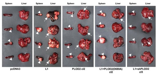 The liver metastasis of the CRC cells conferred by L1 transfection requires endogenous PLOD2 expression. The CRC cell clones described in Figure 2A were injected into the tip of the spleen in groups of four nude mice, and the development of tumors at the site of injection and liver metastasis were determined five weeks after the injection of the various CRC cell clones. White triangles mark tumor growth in the spleen. White arrows mark metastatic foci in the liver.