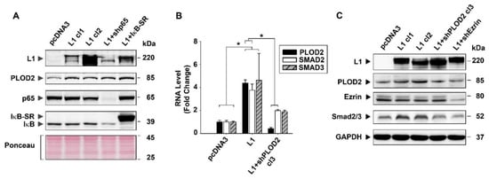 In previous studies, we have shown that the increase in the expression of various genes in CRC cells following L1 transfection operates by a mechanism that involves cooperation between ezrin and NF-κB signaling [,,,]. Since the induction of PLOD2 by L1 depends on ezrin (Supplementary Table S1), we wished to determine the downstream effectors of the ezrin-mediated increase in PLOD2. We began by analyzing the levels of PLOD2 in L1-expressing CRC cells in which the signaling by NF-κB was compromised by the expression of a shRNA against the p65 subunit of NF-κB (Figure 5A, L1 + shp65), or by expressing a mutant form of IκB that suppresses the NF-κB pathway (Figure 5A, L1 + IκB-SR). The results presented in Figure 5A show that interference with the NF-κB pathway in L1-expressing cells did not significantly affect the levels of PLOD2 (Figure 5A, L1 cl1 and cl2, compared to L1 + shp65 and L1 + IκB-SR). This suggests that the induction of PLOD2 that depends on ezrin does not involve the NF-κB pathway.
