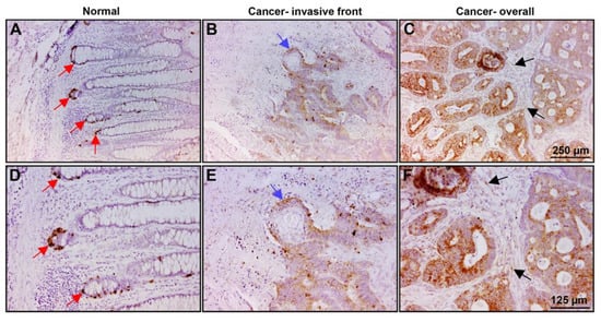 We wished to determine the localization and expression of PLOD2 in the normal mucosa and in human CRC tissue. Paraffin sections from 38 human CRC tissue samples were immunostained with an antibody against PLOD2 (Figure 6). The normal colonic mucosa was negative for PLOD2, except for the staining of the colonic crypts where the stem cell compartment is localized (Figure 6A,D, red arrows). Fifty percent (19/38) of tumor tissue samples showed positive staining for PLOD2, with 74% of the samples displaying preferential staining of cells at the invasive front of the tumor tissue (Figure 6B,E, blue arrow) and 26% stained throughout the tumor tissue (Figure 6C,F). In a few cases, weak staining for PLOD2 was also observed in the stroma around the tumor tissue (Figure 6C,F, black arrows). The results suggest that PLOD2 is localized in the colonic crypts in the stem cell compartment of normal mucosa. In the CRC tissue, PLOD2 is expressed at increased levels, with a preference for the invasive edge of the tumor, suggesting that PLOD2 is involved in promoting human CRC cell invasion.