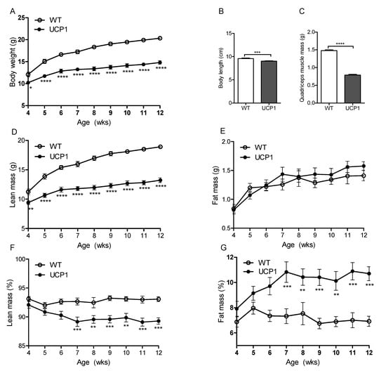 The body weight of female UCP1-TG mice was significantly lower than of WT littermates from week 4 onwards up to the age of 12 weeks, when the animals were sacrificed (Figure 1A). Concomitantly, UCP1-TG mice showed a decreased body length (Figure 1B), quadriceps muscle mass (Figure 1C), and lean body mass (Figure 1D), while total body fat mass was not different (Figure 1E) compared to WT littermates. Consequently, lean body mass percentage was decreased (Figure 1F), while the percentage of body fat mass was increased (Figure 1G) in the UCP1-TG mice from week 7 onwards compared to WT littermate controls.
