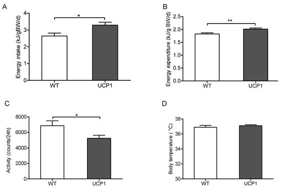 Energy intake (A), energy expenditure (B), activity counts over 24 h (C) and body temperature (D) in 12-week-old UCP1-TG (UCP1) and wild-type (WT) littermate controls fed a chow diet. Data are expressed as mean +/− SEM (n = 8); (A–D): Student’s t-test; * p < 0.05, ** p < 0.01.