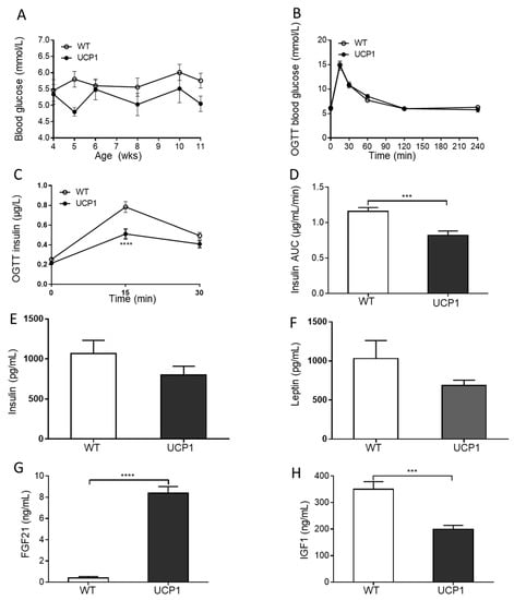 Metabolic health related parameters of UCP1-TG (UCP1) and WT mice. Blood glucose levels from the age of 4 until 11 weeks (A), glucose response to an oral glucose tolerance test (OGTT) at the age of 10 weeks (B), insulin response to the OGTT at the age of 10 weeks (C), incremental area under the curve (AUC) of the insulin response to the OGTT (D), plasma insulin concentrations (pg/mL) (E), plasma leptin concentrations (pg/mL) (F), plasma fibroblast growth factor 21 (FGF21) concentrations (ng/mL) (G) and plasma insulin-like growth factor 1 (IGF1) concentrations (ng/mL) (H). Data are expressed as mean +/− SEM (n = 10); (A–C): two-way ANOVA; (D–H): Student’s t-test, *** p < 0.001, **** p < 0.0001.