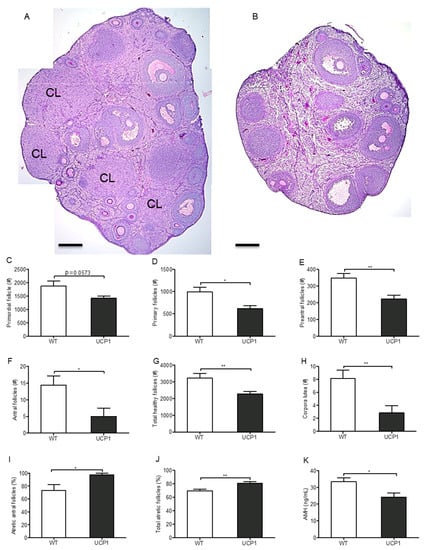 Plasma anti-Müllerian hormone (AMH) concentrations, a marker for the growing follicle pool (primary, preantral and antral follicles) [], were significantly decreased in the UCP1-TG group (Figure 4K), fully in agreement with the histological analysis.