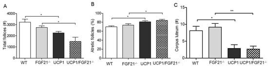 FGF21 and ovarian follicular development. Numbers of healthy follicles (A), percentage of atretic follicles (B), and numbers of corpora lutea (C) in WT (white), FGF21 knock out (FGF21–/–; grey), UCP1-TG (UCP1; black) and FGF21–/–/UCP1-TG (FGF21–/–/UCP1) mice (mixed). Data are expressed as mean +/− SEM (n = 6–8); #, numbers; %, percentage; (A–C): one-way ANOVA; *, p < 0.05; **, p < 0.01.
