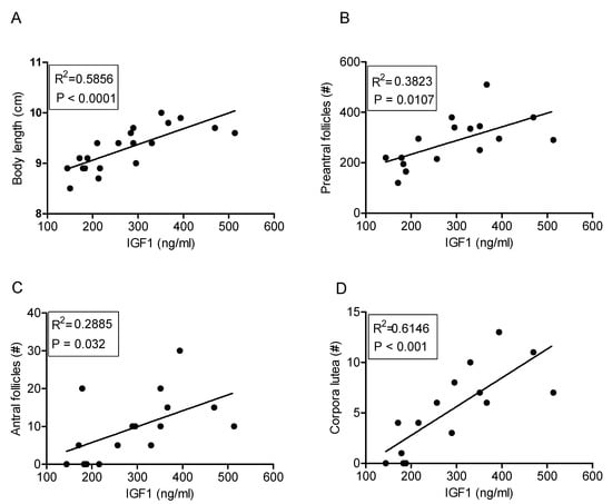 To determine whether the decrease in circulating IGF1 concentrations correlated with the morphometric measurements and ovarian phenotypic changes, linear regression analyses were performed. These analyses showed that plasma IGF1 concentrations were significantly correlated with body length (Figure 6A), preantral and antral follicle numbers (Figure 6B,C), and CL numbers (Figure 6D), indicating that the reduced IGF1 levels in the UCP1-TG mice may play a role in the impaired ovarian follicular development in the UCP1-TG mice.