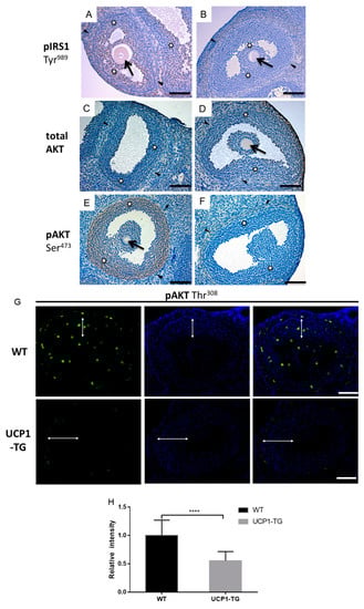 Immunostaining for phosphorylated IRS1, total and phosphorylated AKT Ser473 (brown staining) as markers of IGF1 signaling in healthy antral follicles of WT (A,C,E) and UCP1-TG (B,D,F) mice; immunofluorescence staining for phosphorylated AKT Thr308 in WT and UCP1-TG (G,H). Representative immunostaining of IRS1 phosphorylated at Tyr989 (A,B), total AKT (C,D), AKT phosphorylated at Ser473 (E,F) and AKT phosphorylated at Thr308, green, Thr308; blue, DAPI(G). Phosphorylation of IRS1 and AKT Ser473 is present in the granulosa cells of healthy antral follicles in WT ovaries but faint to absent in UCP1-TG mice. Similarly, immunofluorescence analysis showed the significantly decreased intensity of phosphorylated AKT Thr308 in the granulosa cells of healthy antral follicles in UCP1-TG mice in comparison to WT (H). (H): Student’s t-test, ****, p < 0.0001; total AKT immunostaining is moderate in the granulosa cells of WT animals and UCP1-TG mice. There was no difference in theca and stromal cell staining between the WT and UCP1-TG. Inserts show a detail of the granulosa layer. Arrow—oocyte, asterisk (A–F) and white two-sided arrow (G)—granulosa cells, arrowheads—theca cells. Scar bar represent 50 μm.