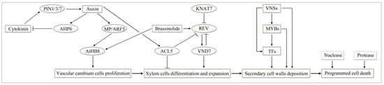 Wood is produced by the activity of the vascular cambium, and requires a complex developmental program involving the proliferation of vascular cambium cells, xylem cell differentiation and expansion, formation of the SCW, lignification and programmed cell death and, finally, mature secondary xylem (including xylem parenchyma cells, vessel, tracheary elements and et al.) formation [,]. The specific procedures for wood formation are as follows.