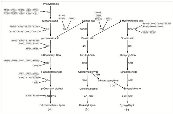 In most plants, the biosynthesis of lignin polymers occurs primarily via the phenylpropane pathway and the lignin-specific pathway. The multiple-branch pathways of the phenylpropane pathway generate a variety of compounds that, for example, provide structural support and increase cell and stem strength and bending resistance [,]. A series of hydroxylation, methylation and reduction reactions occurs in the phenylalanine metabolic pathway, which involves a series of continuous enzymatic reactions. The genes encoding these single-lignol biosynthetic enzymes have been identified and their functions have been characterized in many species []. The phenylalanine metabolic pathway comprises three major steps. The first is the phenylpropane pathway, which includes phenylalanine ammonia lyase (PAL), cinnamate 4-hydroxylase (C4H), and 4-coumarate-CoA ligase (4CL). The phenylpropane lignin-synthesis pathway starts with the generation of cinnamic acid by PAL-phenylalanine. C4H is one of the best-characterized cytochrome P450 hydroxylases in higher plants and catalyzes the conversion of cinnamic acid to p-coumaric acid. Next, p-coumaric acid is activated to 4-coumaroyl-coenzyme A (CoA) by 4CL. Also, 4CL catalyzes the conversion of ferulic acid and erucic acid into ferulyl-CoA and erucyl-CoA. However, the formation of ferulic acid and erucic acid is based on a one-step monomer-methylation reaction involving caffeine-O-methyltransferase (COMT) and ferulic acid 5-hydroxylase (F5H). The third step is monomer synthesis, which involves cinnamoyl-CoA reductase (CCR) and cinnamyl alcohol dehydrogenase (CAD) in the formation of the monomers p-coumarol, coniferyl alcohol, and erucyl alcohol. The three monomers are converted to p-hydroxyphenyl lignin, guaiacyl lignin and syringyl lignin by laccase (LAC) and peroxidase (POX) []. MYB TFs play an important role in the biosynthesis of lignin. For example, PAL (MYB8, []; MYB15, []; MYB46, []; MYB58 and MYB63, []), C4H (MYB15, []; MYB46, []), 4CL (MYB15, []; MYB46, []; MYB58 and MYB63, []), HCT (MYB46, []), C3H (MYB46, []; MYB58 and MYB63, []), CCoAOMT (MYB46, []; MYB58 and MYB63, []), F5H (MYB103, [,,]), CCR (MYB46, []; MYB58 and MYB63, []), and CAD (MYB15, []; MYB46, []; MYB58 and MYB63, []).