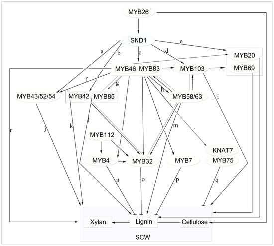 Proposed model of MYB-mediated secondary cell wall (SCW) regulation in Arabidopsis. Solid black and flat-headed arrows represent positive and negative transcriptional regulation, respectively. Dashed lines represent co-expression relationships, MYB26 and SND1, MYB46/83, and other TFs represent the first, second, and third layers of the transcriptional regulatory network, respectively. The expression of 9 SND1-regulated transcription factors, namely, MYB20, MYB42, MYB43, MYB52, MYB54, MYB69, MYB85, MYB103, was developmentally associated with cells undergoing secondary wall thickening (a, b, c, d, e; []). MYB46 and MYB83 serve as the second layer of the main switch for secondary cell wall biosynthesis, which activate downstream transcription factors (including MYB20, MYB42, MYB43 and MYB85) by binding to SMRE sequence in an SCW MYB-responsive element (f, g, h, r; [,]) and directly or indirectly regulate the biosynthesis of the secondary wall. MYB42, MYB43, MYB85 (j, k, l; []), MYB58, MYB63 (m; []), MYB103 (i; []) are transcriptional regulators that directly activate lignin biosynthesis genes during secondary wall formation in Arabidopsis. MYB4, MYB7, MYB32, MYB75 are inhibitors of lignin biosynthesis (n, o, p, q; []). The concerted actions of the MYB TFs in this network leads to a coordinated activation of SCW biosynthetic genes, which results in the synthesis of lignin, cellulose, xylan.