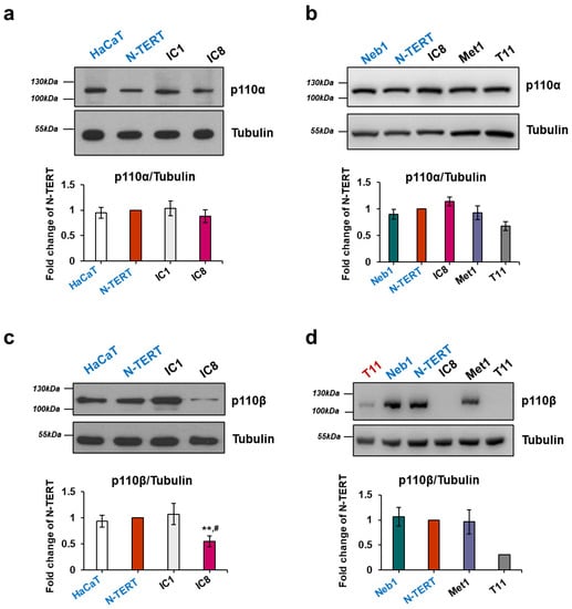 Keratinocyte and cutaneous squamous cell carcinoma (cSCC) cell lines express class I phosphoinositide 3-kinase (PI3K) isoforms p110α and p110β. Immortalized keratinocytes (HaCaT, N-TERT and Neb1, labelled in blue) and cSCC cells (IC1, IC8, Met1 and T11) were lysed with 2% SDS and expression of the indicated class I PI3K isoforms was analyzed by Western blotting. Tubulin was used as loading control. Signals were visualized using X-ray films and a film processor (a,c) or using Chemidoc™ MP Imaging System (b,d). Representative blots are shown. Graphs indicate data from densitometry analysis for each enzyme, normalized to Tubulin and expressed as fold change of results from N-TERT cells. Data are means ± SEM from the following numbers of lysates, prepared independently from different batches of cells: n = 6 ((a), apart from IC1, n = 5), n = 3 (b), n = 6 (c) and n = 3 ((d), apart from T11, n = 1). Note that p110β was barely detectable and not quantifiable in IC8 cells using Chemidoc™ MP Imaging System (d) therefore densitometry analysis could not be performed for these cells in these experiments. Similarly, the band was detectable and quantifiable in only one of the T11 lysates in these conditions therefore only this set (labelled in red) was used for analysis in (d). See also Supplementary Figure S1d. ** p < 0.01 vs. N-TERT, # p < 0.05 vs. HaCaT.