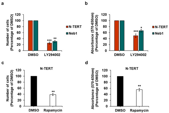Having confirmed expression of class I PI3K isoforms, we next determined whether these enzymes were involved in regulation of growth and viability of the selected cell lines. First, we observed that treatment with the pan PI3K inhibitor LY294002 reduced the number of N-TERT and Neb1 cells (Figure 2a) as well as their viability assessed by MTT assays (Figure 2b). Treatment with the mTOR inhibitor rapamycin also reduced numbers (Figure 2c) and viability (Figure 2d) of N-TERT cells, consistent with data in the literature indicating the crucial role of the PI3K/Akt/mTOR pathway in keratinocytes [19,20,21].