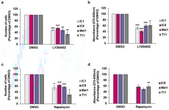 The PI3K/Akt/mTOR pathway regulates growth and viability of cSCC cell lines. The indicated cSCC cell lines were treated with 10 µM LY294002 (a,b) or 10 nM rapamycin (c,d) in complete medium supplemented with 10% FBS. Control cells were treated with vehicle alone (DMSO). After 72 h, number of cells was assessed by cell counting (a,c) and cell viability was assessed by MTT assays (b,d). Data are expressed as percentage of results from control cells and are means ± SEM from n = 4 ((a), IC1, IC8, Met1), n = 7 ((a), IC1); n = 5 ((b), IC8), n = 7 ((b), Met1), n = 4 ((b), T11), n = 10 ((b), IC1); n = 3 ((c), IC1,T11), n = 6 ((c), Met1), n = 9 ((c), IC8); n = 2 ((d), IC8, Met1) and n = 3 ((d), T11) independent experiments performed in duplicate (a,c) or triplicate (b,d). * p < 0.05, ** p < 0.01, *** p < 0.001 vs. DMSO.