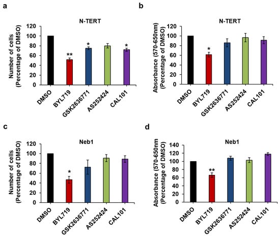 The p110α inhibitor BYL719 is the most effective in reducing both cell numbers and viability of keratinocytes. N-TERT (a,b) and Neb1 (c,d) cells were treated with 1 µM of the indicated inhibitors or vehicle (DMSO) in complete medium supplemented with 10% FBS. After 72 h, number of cells was assessed by cell counting (a,c) and cell viability was assessed by MTT assays (b,d). Data are expressed as percentage of results from cells treated with DMSO and are means ± SEM from n = 3 (a), n = 3 (b), n = 3 (c) and n = 4 (d) independent experiments performed in duplicate (a,c) or triplicate (b,d). * p < 0.05, ** p < 0.01 vs. DMSO.
