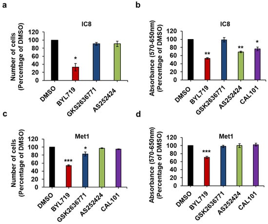 The p110α inhibitor BYL719 is the most effective in reducing IC8 and Met1 cell numbers and viability. IC8 (a,b) and Met1 (c,d) cells were treated with 1 µM of the indicated inhibitors or vehicle (DMSO) in complete medium supplemented with 10% FBS. After 72 h, number of cells was assessed by cell counting (a,c) and cell viability was assessed by MTT assays (b,d). Data are expressed as percentage of results from cells treated with DMSO and are means ± SEM from n = 3 ((a), apart from AS252424, n = 6), n = 3 (b), n = 5 ((c), apart from GSK2636771, n = 4) and n = 5 (d) independent experiments performed in duplicate (a,c) or triplicate (b,d). * p < 0.05, ** p < 0.01, *** p < 0.001 vs. DMSO.
