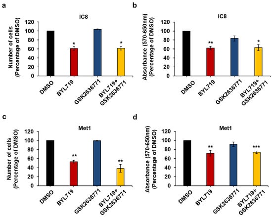 In addition, combination of BYL719 and GSK2636771 did not result in any significant increase in the effect of the p110α inhibitor on IC8 and Met1 cell numbers (Figure 7a,c) or viability (Figure 7b,d) compared to treatment with BYL719 alone.