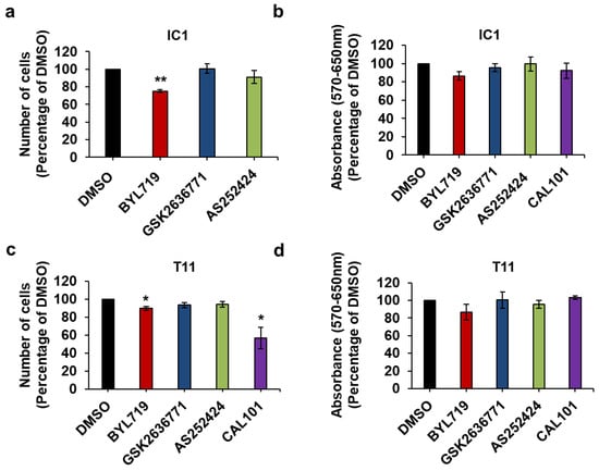 In contrast to IC8 and Met1 cells, BYL719 had only a very small effect on IC1 (Figure 8a) and T11 (Figure 8c) cell numbers with reduction not reaching statistical significance in MTT assays (Figure 8b,d). No effect was detected in MTT assays upon treatment of IC1 cells with lower concentrations of either BYL719 or GSK2636771 (Supplementary Figure S6d). None of the other inhibitors affected IC1 or T11 cells at the concentration tested, apart from CAL101 reducing T11 cell numbers significantly (Figure 8c).