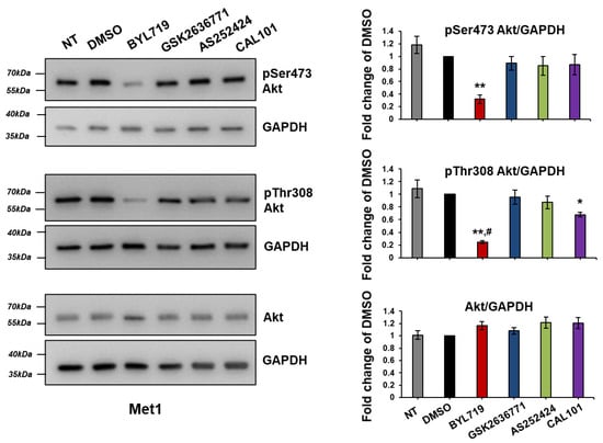 BYL719 inhibits Akt phosphorylation in Met1 cells. Met1 cells were treated with 1 µM of the isoform-specific inhibitors in complete medium supplemented with 10% FBS. Control cells were treated with DMSO or left untreated (NT). Cells were lysed after 1 h and Akt phosphorylation at residues Ser473 and Thr308 as well as total levels of Akt were determined by Western blotting. Glyceraldehyde 3-phosphate dehydrogenase (GAPDH) was used as loading control. Signals were visualized using Chemidoc™ MP Imaging System. Graphs indicate results from densitometry analysis of phosphorylated or total Akt normalized to loading control and expressed as fold change of results from DMSO-treated cells. Data are means ± SEM from n = 3 independent experiments (apart from NT in pSer437 Akt graph, n = 2). * p < 0.05, ** p < 0.01 vs. DMSO; # p < 0.05 vs. NT.