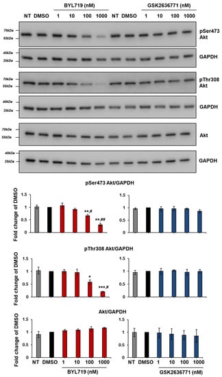 BYL719 inhibits Akt phosphorylation in T11 cells in a dose-dependent manner. T11 cells were treated for 1 h with increasing concentrations of BYL719 and GSK2636771 in complete medium supplemented with 10% FBS. Control cells were left untreated (NT) or treated with DMSO. Phosphorylation and total levels of Akt were analyzed by Western blotting, with GAPDH used as loading control. Signals were visualized using Chemidoc™ MP Imaging System. Graphs show results from densitometry analysis of phosphorylated or total Akt normalized to loading control and expressed as fold change of results from DMSO-treated cells. Data are means ± SEM from the following numbers of independent experiments: pSer473 Akt, n = 3 (apart from GSK2636771 1 µM, n = 2); pThr308 Akt, n = 3 (apart from NT in BYL719 graph and GSK2636771 1 µM, n = 2); Akt, n = 3 (apart from NT in BYL719 graph and GSK2636771 100 nM and 1 µM, n = 2); ** p < 0.01 vs. DMSO; ## p < 0.01 vs. NT.