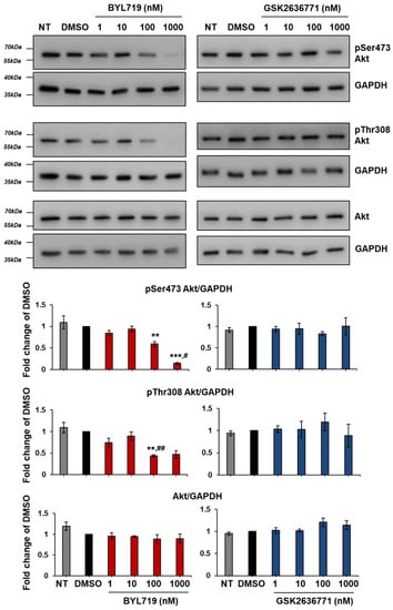BYL719 inhibits Akt phosphorylation in IC8 cells in a dose-dependent manner. IC8 cells were left untreated (NT) or treated for 1 h with increasing concentrations of BYL719 and GSK2636771 in complete medium supplemented with 10% FBS. Control cells were treated with DMSO. Phosphorylation status and total levels of Akt were analyzed by Western blotting. GAPDH was used as loading control. Signals were visualized using Chemidoc™ MP Imaging System. Graphs show results from densitometry analysis of phosphorylated or total Akt normalized to loading control and expressed as fold change of results from DMSO-treated cells. Only blots showing clearly detectable bands were used for densitometry analysis. Data are means ± SEM from the following numbers of independent experiments: pSer473 Akt, n = 4 (apart from NT in BYL719 graph and from BYL719 1 nM, BYL719 10 nM and GSK2636771 100 nM, n = 3); pThr308 Akt, n = 4 (apart from BYL719 1 nM, 10 nM and 100 nM, n = 3 and BYL719 1 µM, n = 2); Akt, n = 4 (apart from NT, n = 3); ** p < 0.01, *** p < 0.001 vs. DMSO; # p < 0.05, ## p < 0.01 vs. NT.