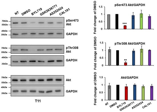 We next investigated the effect of the isoform-specific inhibitors on T11 and IC1 cells. Data revealed that treatment with BYL719 for 1 h was able to inhibit Akt phosphorylation in T11 cells without affecting total levels of Akt (Figure 13, Supplementary Figure S13), similarly to results obtained in Met1 and IC8 cells. None of the other inhibitors affected Akt phosphorylation at the tested concentration (Figure 13, Supplementary Figure S13).