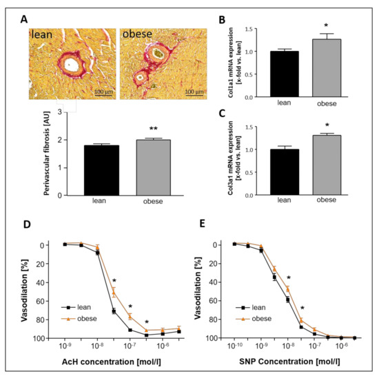 Perivascular as well as overall LV fibrosis were analyzed and revealed significantly enhanced collagen levels in both the vessel environment and the left ventricular tissue (Figure 1A–C). Moreover, endothelial-dependent (Figure 1D) and independent (Figure 1E) vasodilating properties of carotid arteries were impaired in the ZSF1-obese animals.