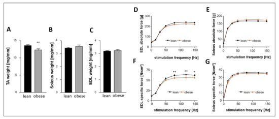 Regarding the skeletal muscle we measured a significant lower weight of the tibialis anterior (TA, Figure 2A) in the obese group whereas the weight of Soleus (Figure 2B) and extensor digitorum longus (EDL, Figure 2C) was not significantly different between the groups. While absolute force of EDL and Soleus were comparable between both groups (Figure 2D,E), specific force was lower in the EDL (Figure 2F) but not in the Soleus (Figure 2G).