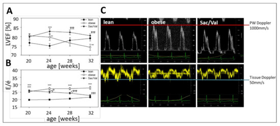 Development of cardiac function during 12 weeks of Sac/Val treatment. Systolic (A) and diastolic function (B) of lean, obese, and Sac/Val treated obese ZSF1 rats indicated by the LVEF and the ratio E/é. Comparison of representative pulsed wave (PW) Doppler and Tissue Doppler sequences after 12 weeks of Sac/Val or sedentary life style (C). n = 15 (each, lean and obese) and n = 13–15 (Sac/Val). To test the effect of Sac/Val two-way one-way analysis of variance (ANOVA) with repeated measures followed by Bonferroni post hoc was used to compare echo data between the groups over time. * p < 0.05, ** p < 0.01, *** p < 0.001 vs. lean, respectively. Ɨ p < 0.05, ƗƗƗ p < 0.001 vs. obese.