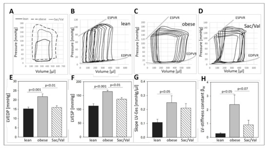 - After 12 weeks of Sac/Val treatment, we observed significantly lower LV pressure in systole (LVESP) and diastole (LVEDP) as well as reduced left ventricular stiffness compared to the obese control group.