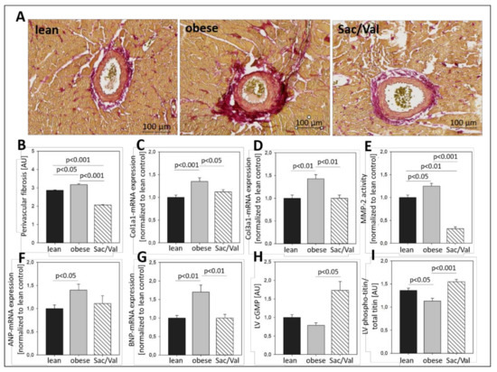 Over the course of the experiment, the ratio E/é in the Sac/Val treated group continuously declined and became first significantly lower than its obese control group after four weeks of treatment (Figure 3B). Moreover, 12 weeks of Sac/Val treatment improved the hemodynamic conditions in the left ventricle and the diastolic compliance, as indicated by reduced left ventricular stiffness (Figure 4). To estimate changes of the ventricular stiffness we determined LVEDP and the chamber stiffness constant βW, which are widely accepted to serve as load and chamber size-independent parameters of passive chamber properties [18,19]. Therefore, it is unlikely that the observed reduced LV stiffness in the treated group was a result of pure blood pressure reduction. Our findings were accompanied by reduced myocardial fibrosis (Figure 5A–D) and restored titin phosphorylation (Figure 5I), both indicating preserved left ventricular elasticity. The observed reduced left ventricular collagen expression levels in the Sac/Val treated group of the present study (Figure 5A–D) are in accordance with Sac/Val studies in patients, expressing reduced profibrotic biomarkers in both HFrEF 28 and HFpEF [20].