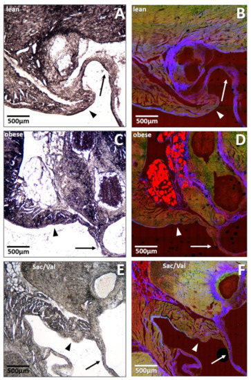 To estimate the extent of intramyocardial fat deposition and its potential role in the observed diastolic dysfunction, native cryo-embedded heart slices were used for brightfield microscopy and nonlinear optical microscopy (NLOM) at the level of the mitral valve annulus. Representative pictures are shown in Figure 6. When we compared sections of all three groups, a high degree of fat deposition was obvious in obese control rats (Figure 6C,D), while lean control rats barely showed any fat inserts at all (Figure 6A,B). Mitral-valve annuli of Sac/Val treated obese rats presented with strikingly reduced fat deposits compared to the obese control (Figure 6E,F).