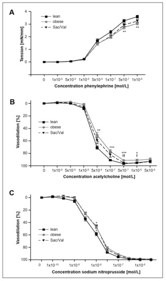 Contractile and vasodilative properties of left arterial carotid sections after 12 weeks of Sac/Val. Comparison of tension (A), endothelial-dependent (B), and endothelial-independent (C) vasodilation of left arterial carotid sections of lean, obese and Sac/Val treated obese ZSF1 rats after 12 weeks of Sac/Val or sedentary lifestyle. n = 13–15. To test the effect of Sac/Val, two-way ANOVA with repeated measures followed by Bonferroni post hoc was performed. * p < 0.05, ** p < 0.01, *** p < 0.001 vs. lean. Ɨ p < 0.05, ƗƗ p < 0.01 vs. obese.