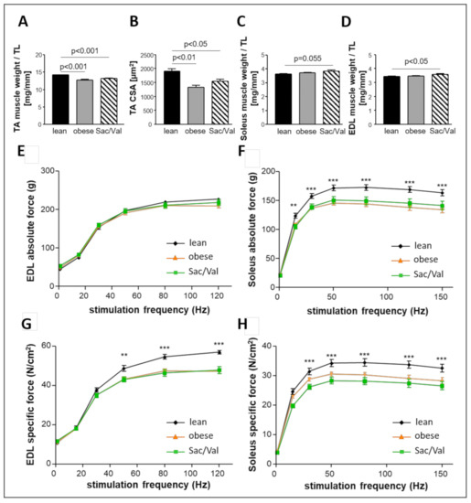 Skeletal muscle weight and function after 12 weeks of Sac/Val. Muscle weight (normalized to tibia length (TL)) (A) and cross-sectional area (CSA) of the TA muscle (B). Muscle weight of the Soleus (C) and the EDL (D), each normalized to tibia length. Absolute (E,F) and specific force (G,H) of the EDL (E,G) and Soleus (F,H). n = 13–15. To test the effect of Sac/Val, two-way ANOVA with repeated measures followed by Bonferroni post hoc was performed. ** p < 0.01, *** p < 0.001 vs. lean, respectively.