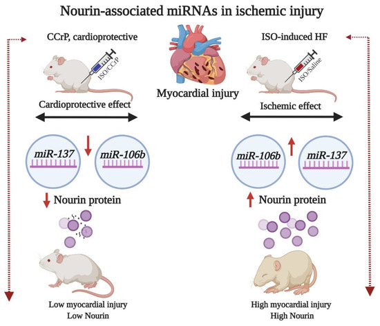 A flow diagram at day 14 illustrating that ischemia-induced ISO rats which developed HF show upregulation of Nourin-associated miR-137 (marker of cell damage) and miR-106b-5p (marker of inflammation) with a likely increase in translation and production of the Nourin protein. The diagram also indicates amelioration of myocardial ischemic injury and the molecular regulation of the Nourin protein when rats were treated with the cardioprotective compound, CCrP, in rats that did not develop HF. ISO: isoproterenol, CCrP: cyclocreatine phosphate.