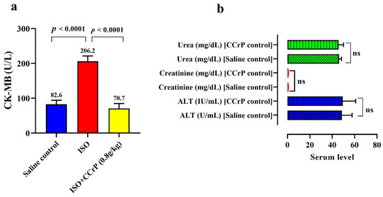 Serum creatine kinase-MB (CK-MB) (U/L) was measured 24 h after the last ISO injection to confirm development of myocardial injury (Figure 2a). The saline-treated ISO rats (ISO/saline) had very high levels of CK-MB of 206.20 ± 15.3 U/L, with a 2.49-fold increase over the control/saline rats (82.6 ± 11.6 U/L) (p < 0.0001), indicative of the presence of myocardial injury. On the other hand, CCrP-treated ISO (ISO/CCrP) rats showed low levels of CK-MB (71 ± 14.2 U/L) (p < 0.0001), which were comparable to the baseline healthy/saline rats. The absence of elevation of CK-MB in the ISO/CCrP rats confirms our previous findings that CCrP treatment prevents ischemic injury and maintains healthy hearts [6,9,12]. Furthermore, we determined if there is any toxic effect of CCrP therapy at 0.8 g/kg/day for 14 days on renal and liver function. The results revealed no significant difference for the serum level of the liver necrosis marker, alanine transaminase (ALT), blood urea, and serum creatinine between the saline control and the CCrP control group (Figure 2b). Additionally, the lack of effect of CCrP on the Nourin miRNA gene expression by cardiac tissue (Figure 3a,b) is supported by the absence of toxicity of CCrP on liver (ALT) and kidney (urea, creatinine) function. Thus, results of this limited safety study suggest that CCrP has no toxicity in heart, liver, and renal function.