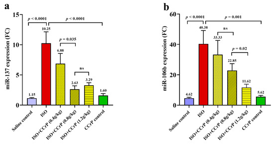 As indicated in Figure 3, ISO rats treated with CCrP at a dose of 0.8 g/kg/day for 14 days showed significant reduction of gene expression of miR-137 by 75% (Figure 3a) (p < 0.0001) and of miR-106b by 44% (Figure 3b) (p < 0.0001). CCrP at a lower dose of 0.4 g/kg/day showed a 33% reduction of miR-137, while at the higher dose of 1.2 g/kg/day, it showed a reduction of 68% (Figure 3a). Similarly, CCrP at doses of 0.4 g/kg/day and 1.2 g/kg/day showed a significant reduction of gene expression of miR-106b-5p by 18% and 72%, respectively (Figure 3b). As indicated in Figure 3, CCrP reduced expression of Nourin-associated miR-137 and miR-106b-5p in a dose–response manner. Additionally, CCrP treatment of healthy rats at 0.8 g/kg/day for 14 days did not affect gene expression levels of Nourin-associated miR-137 and miR-106b-5p (Figure 3a,b) compared to the saline-treated healthy rats with baseline values, suggesting lack of toxicity in rat hearts. These results are supported by absence of CCrP effect on kidney and liver function (Figure 2b).