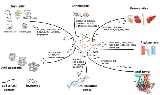 Among the “galaxy” of intercellular signals in which MSC participate, those of an immunomodulatory, regenerative, anti-oxidative stress, angiogenic, anti-fibrotic, anti-tumoral, and anti-microbial nature draw attention (Figure 1).