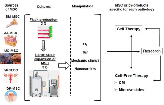 Bone marrow, subcutaneous fat, Wharton’s jelly, and umbilical cords are the more used sources of MSC [] named BM-MSC, SF-MSC, WJ-MSC, and UC-MSC, respectively. However, others such as fetal/neonatal tissues [,,,], dental pulp [], or placenta [] are becoming of increased interest.
