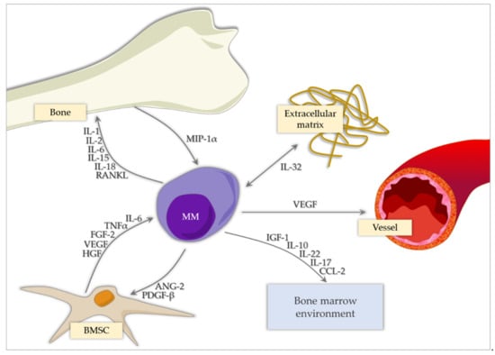 The roles of several growth factors in the course of multiple myeloma have been confirmed. As the process of angiogenesis is of high significance in the progression of MM, the imbalance between antiangiogenic and proangiogenic factors may be the reason for angiogenic switch, leading to the vascular phase of the disease [,]. It has been proven [] that the elevated levels of growth factors give rise to the use of antiangiogenic drugs in curing MM; however, among those particles, some seem to be good candidates for prognostic factors in this disease. Here, one may enumerate FGF-2 (Fibroblast growth factor 2), VEGF (Vascular endothelial growth factor), HGF (Hepatocyte growth factor), PDGF- (Platelet-derived growth factor), and ANG-2 (Angiopoietin -1).